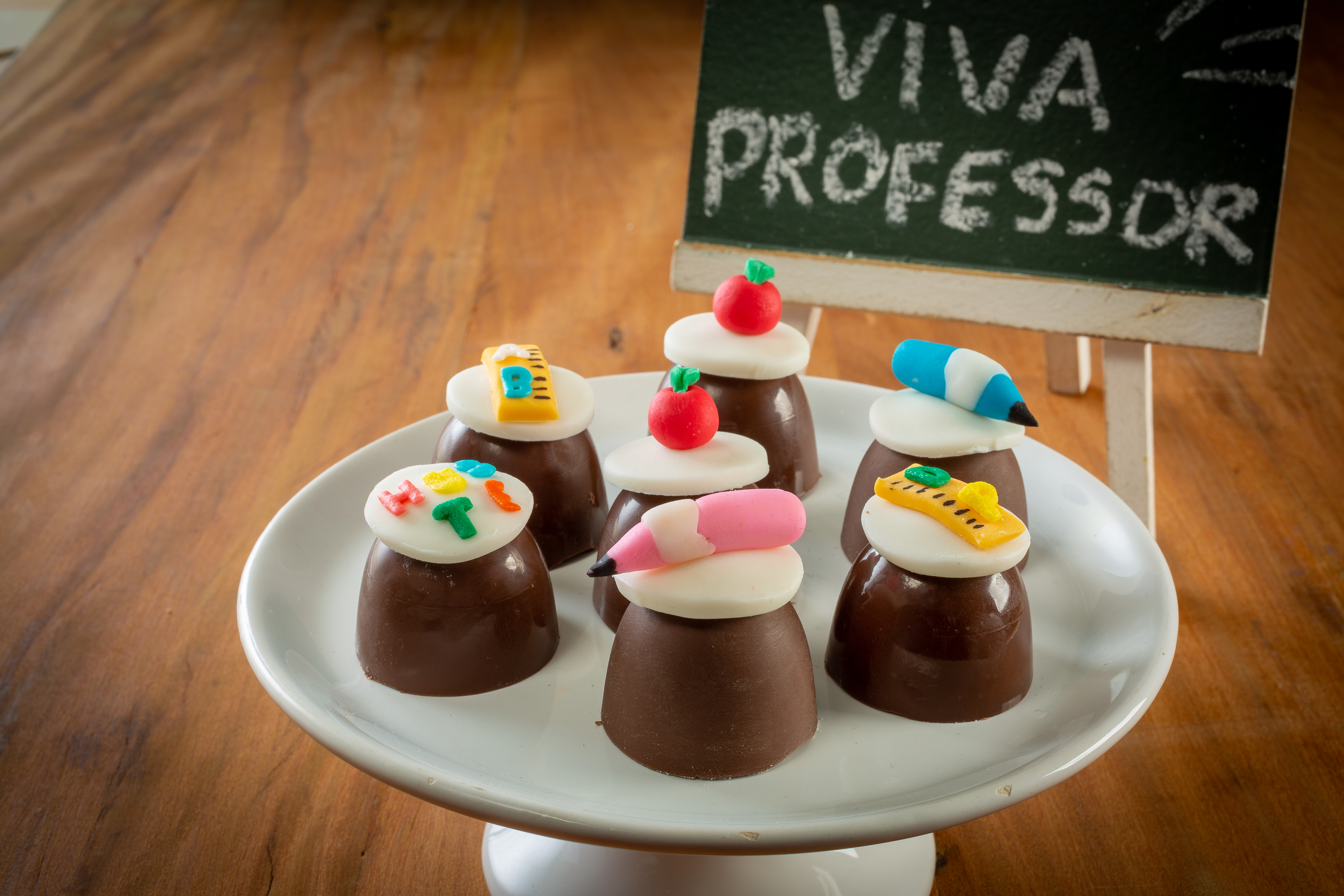 Recheie as casquinhas com o recheio trufa cremosa de morango e feche com a Cobertura derretida. Passe a mão em algumas trufas para ficar sem brilho. Com o auxílio de um rolo, abra a Pasta Americana e corte com o cortador redondo pequeno e cole sobre a trufa com a Cobertura derretida, reserve. Tinja a Pasta Americana com os corantes em gel rosa, azul, preto, vermelho, verde e laranja. Modele lápis, maçãs, réguas, cole sobre a trufa com um pouquinho de água e decore com o Confeito Alfabeto.