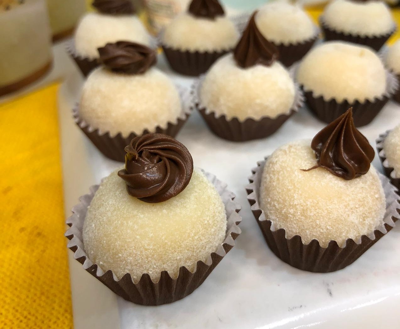 Brigadeiro: Em uma panela coloque o leite condensado, farinha de trigo e leite em pó, misture muito bem, acrescente o creme de leite e leve para cozinhar até chegar ao ponto para enrolar, adicione a cobertura branca e termine de cozinhar. Vire o brigadeiro em um prato passe o filme e deixe descansar até obter consistência para enrolar.
