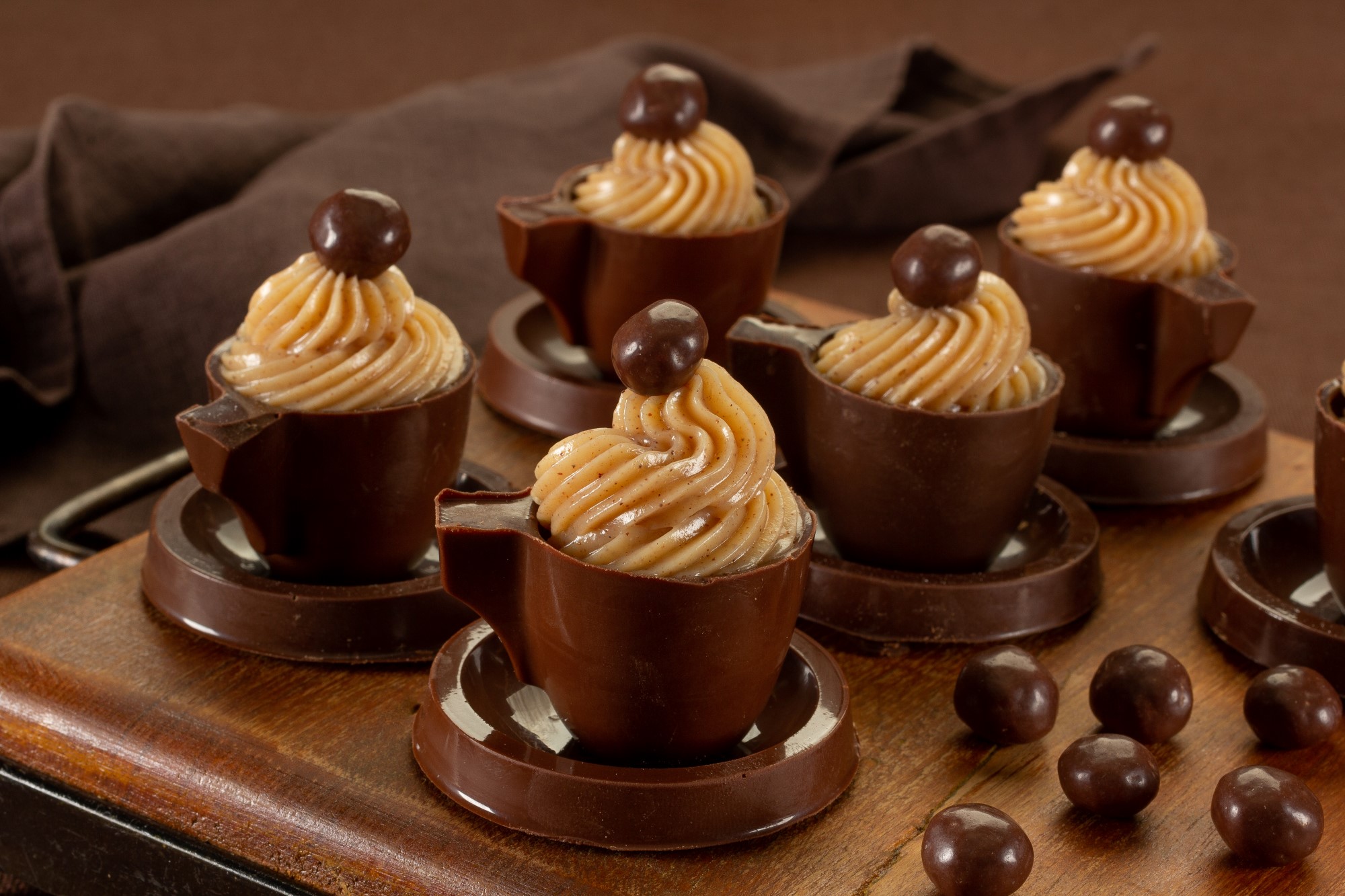 Xícara e pires: Em um recipiente, derreta a Cobertura Meio Amarga em banho-maria ou micro-ondas. Preencha a forma de silicone no formato de xícara e pires, seguindo as instruções da embalagem e leve à geladeira até ficar opaca. Retire e reserve.