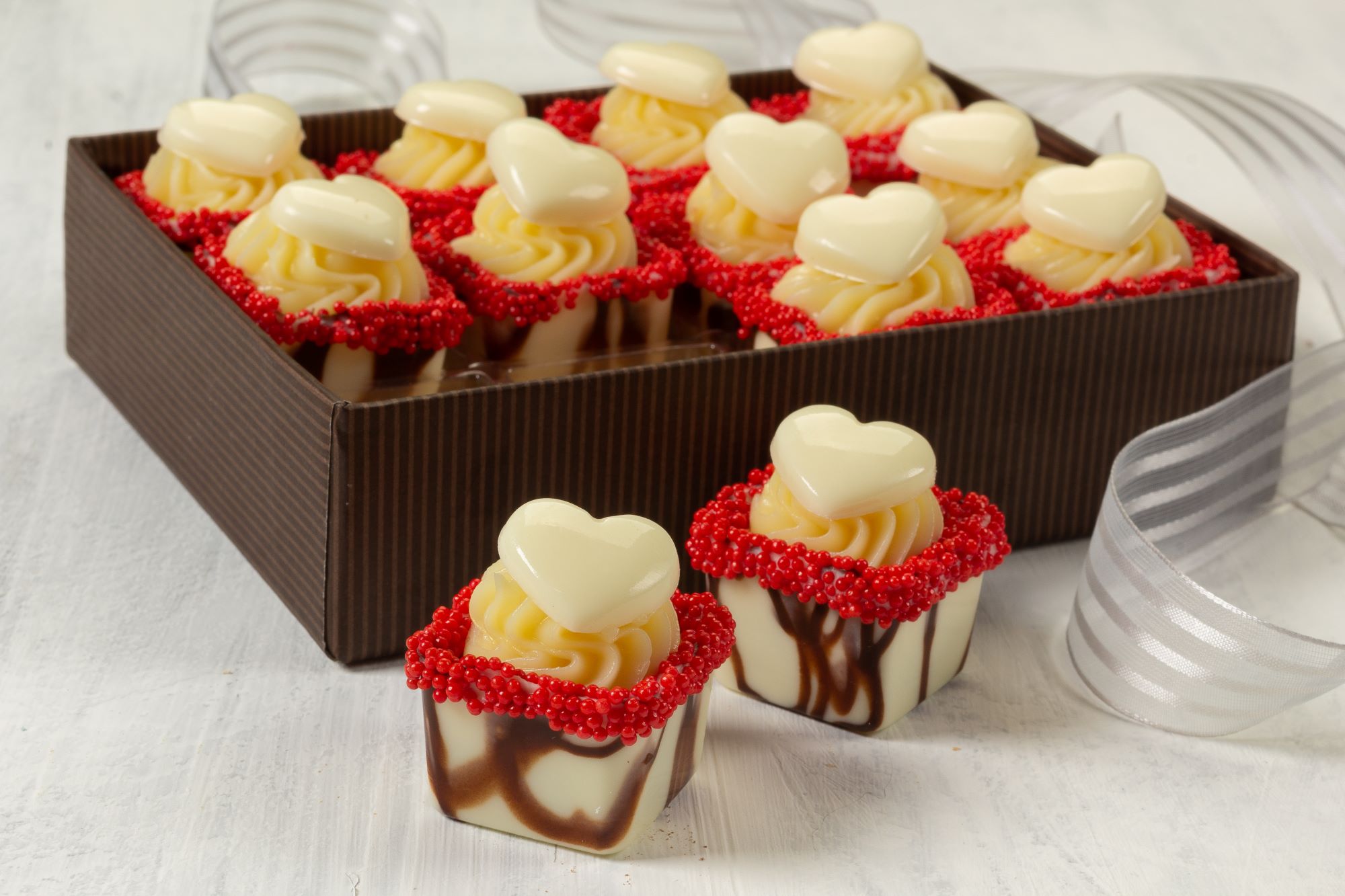 Em um recipiente, derreta a Cobertura Branca em banho-maria ou micro-ondas, preencha a forminha de acetato em formato de coração e leve à geladeira até ficar opaca, retire e reserve. Mergulhe a borda da caixinha na Cobertura Branca derretida, passe no Confeito Miçanga Vermelha e reserve. Coloque o recheio de brigadeiro de leite em pó em uma manga de confeitar com bico pitanga pequeno e preencha as caixinhas. Finalize com o coração.