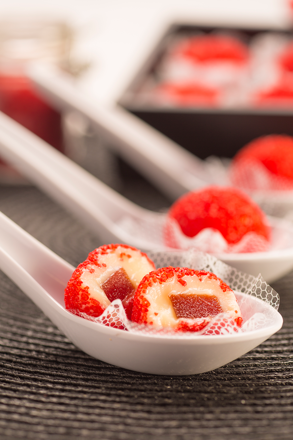 Em uma panela de fundo grosso, coloque o leite condensado, a Cobertura Branca, o cream cheese e o queijo ralado, leve ao fogo até ficar no ponto de enrolar. Retire do fogo e deixe esfriar. Pegue um pouco da massa do brigadeiro, abra na palma da mão, coloque um cubinho de goiabada e enrole. Passe no Açúcar Vermelho.