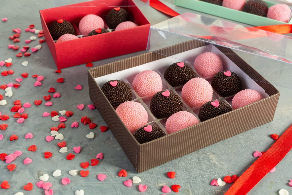 Brigadeiro Blend: Em uma panela, coloque o leite condensado e o Chocolate em Pó, misture bem até dissolver. Em seguida, acrescente o creme de leite e a Cobertura Blend, leve ao fogo, mexendo sempre até ficar no ponto de enrolar. Retire e deixe esfriar. Depois de frio enrole bolinhas e passe na Miçanga Sabor Chocolate. Coloque um Confeito Coração sobre o brigadeiro.