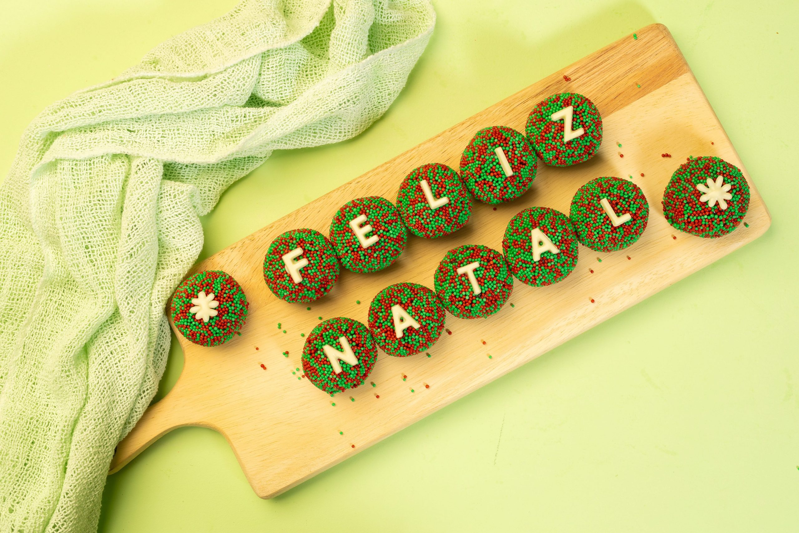 Enrole o brigadeiro, abra e coloque um pedaço de panetone e boleie. Em seguida passe na Miçanga Verde e Vermelha, reserve. Em um recipiente derreta a Cobertura Branca em banho-maria ou micro-ondas. Em seguida preencha forminha de acetado de alfabeto e leve a geladeira até cristalizar. Desenforme, passe a cobertura derretida na letra e cole sobre os brigadeiros.
