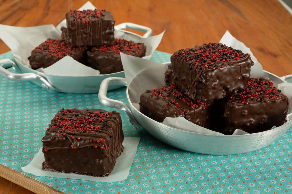 Cobertura e Decoração: Em um recipiente derreta a Cobertura Meio Amarga em banho-maria ou micro-ondas. Reserve. Corte o brownie já frio no tamanho desejado e banhe na Cobertura derretida reservada e coloque sobre um papel manteiga, decore com os Confeitos Miçanga Preta e Vermelha e deixe secar.