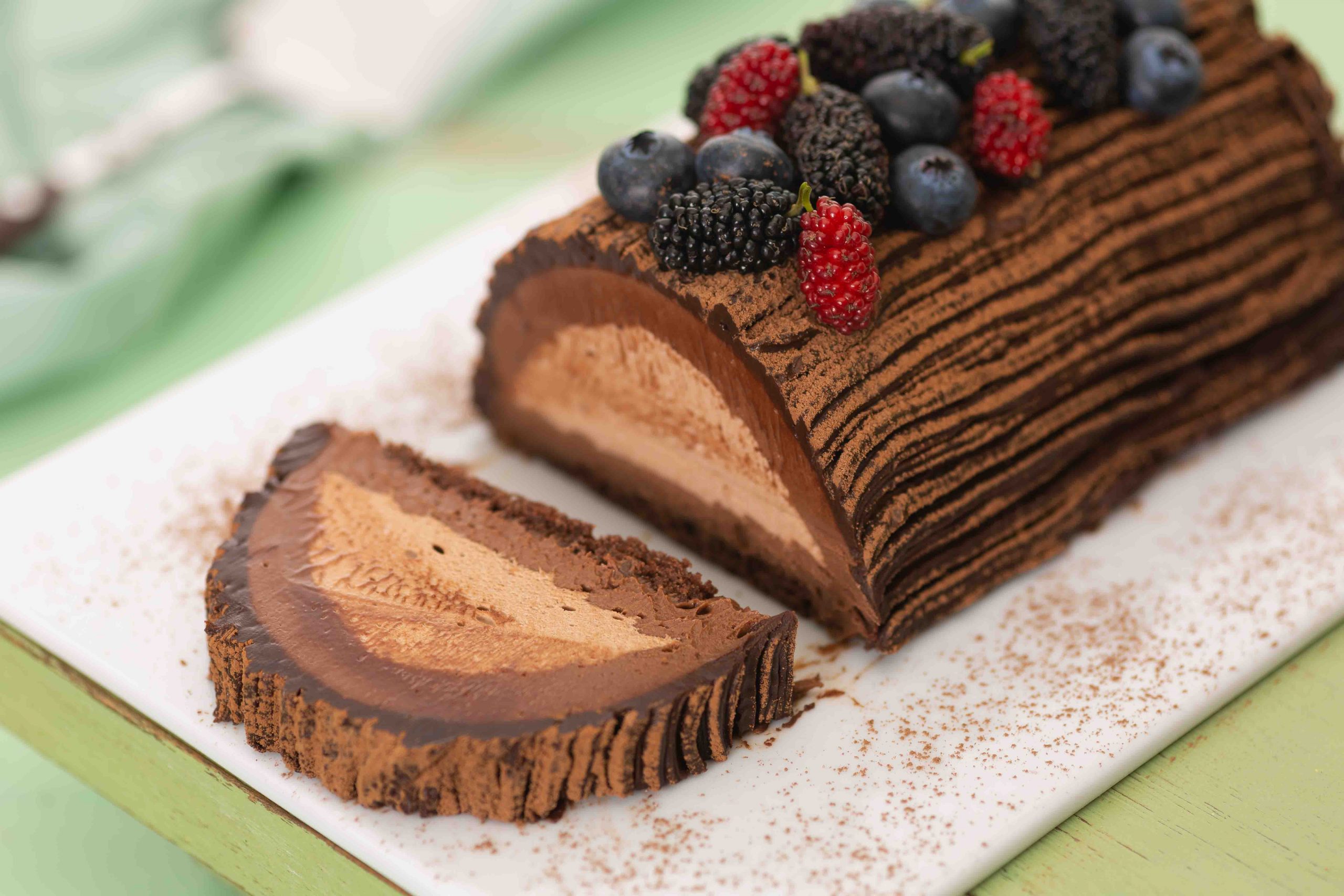Unte com desmoldante uma forma no formato de meia lua (calha) de 30 cm comprimento x 6 cm de altura x 9 cm largura. Espalhe a primeira camada da mousse amarga acompanhando o formato da forma, em seguida, coloque a mousse ao leite preenchendo a cavidade. No final, complete com mais mousse amarga e finalize com fatias de bolo de chocolate de sua preferência. Leve ao freezer por aproximadamente 2 horas. Em seguida, retire, desenforme e corte ao meio. Coloque a cobertura trufada meio amarga em uma Manga de Confeitar com o Bico 234 e aplique em cima da mousse, fazendo o formato de casca de árvore. Peneire Cacau em Pó e decore com frutas vermelhas.
