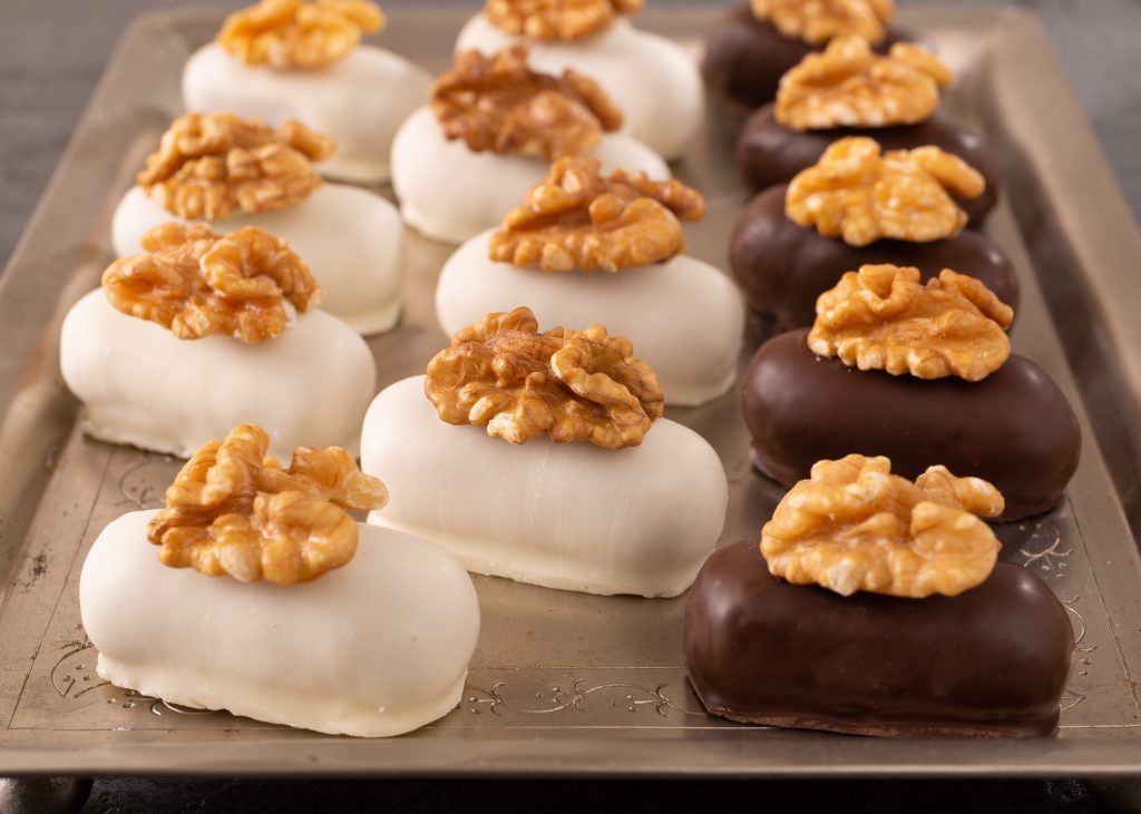 Depois de frio enrole a massa do camafeu e banhe na Cobertura Branca derretida em banho-maria ou micro-ondas. Em seguida coloque uma noz.