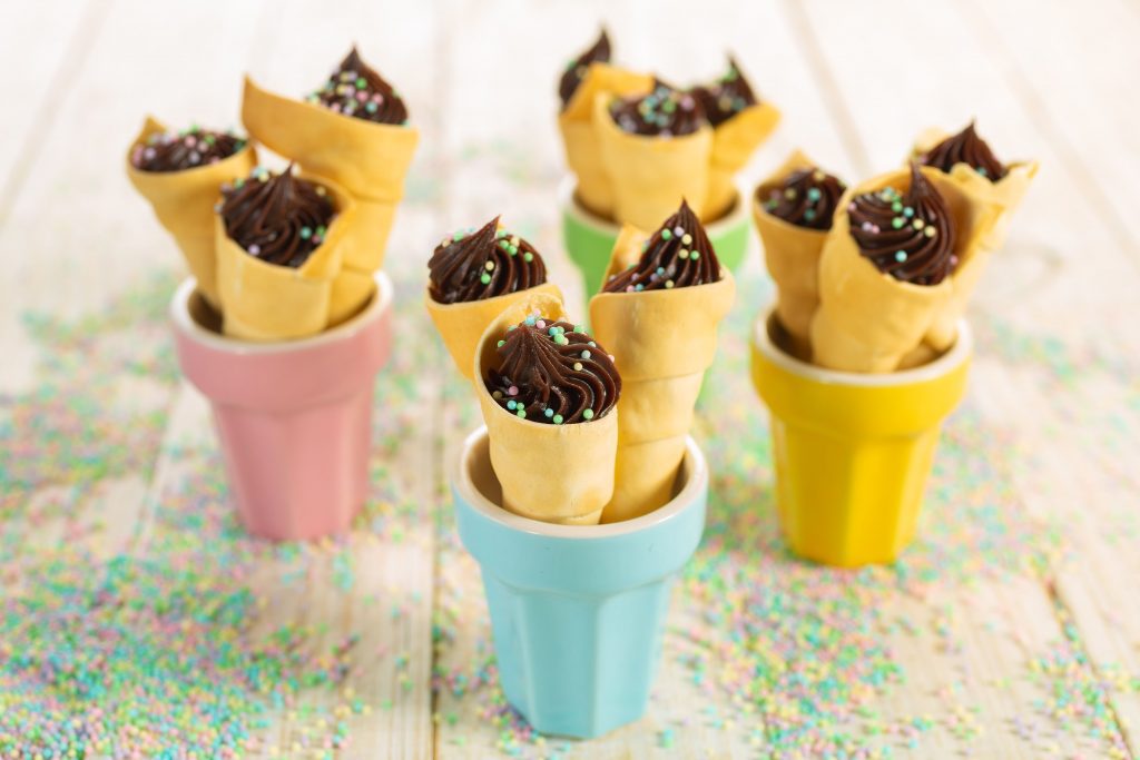 Montagem: Coloque o brigadeiro cremoso em uma Manga de Confeitar com o Bico 4B, preencha os canudos e decore com a Miçanga Colorida Baby.