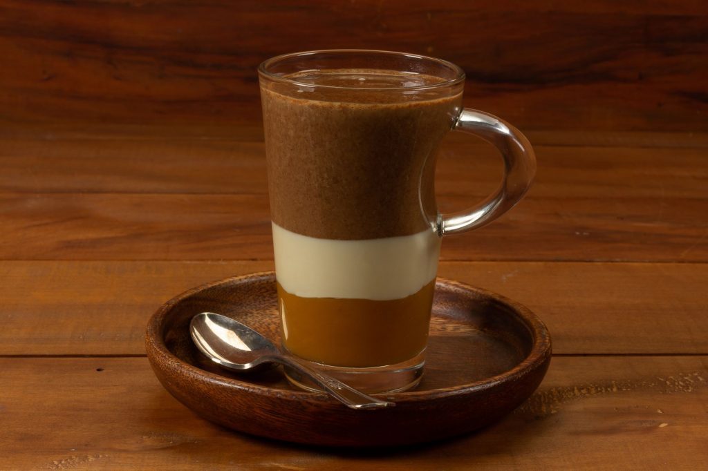 Em uma xícara coloque o doce de leite, em seguida, o ganache branco e por último, o cappuccino quente.