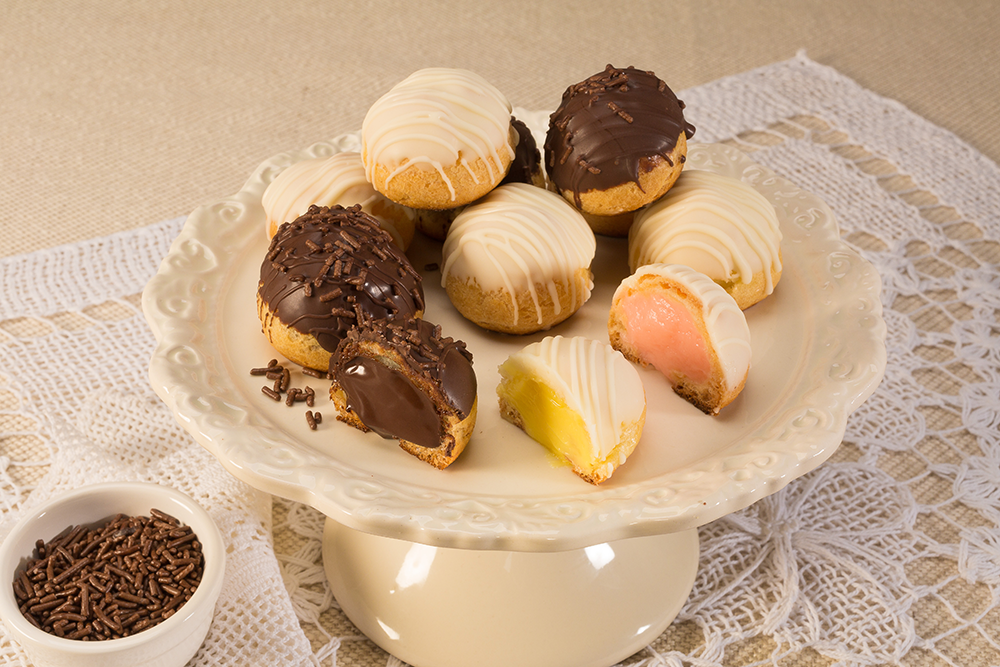 Faça um furo na base da carolina e recheie com os cremes de Maracujá, Morango e Brigadeiro. Reserve. Em recipiente separado derreta as Coberturas Branca e Meio Amarga em banho-maria ou micro-ondas e banhe as carolinas recheadas. Decore com risquinho de Cobertura Branca e Granulados.
