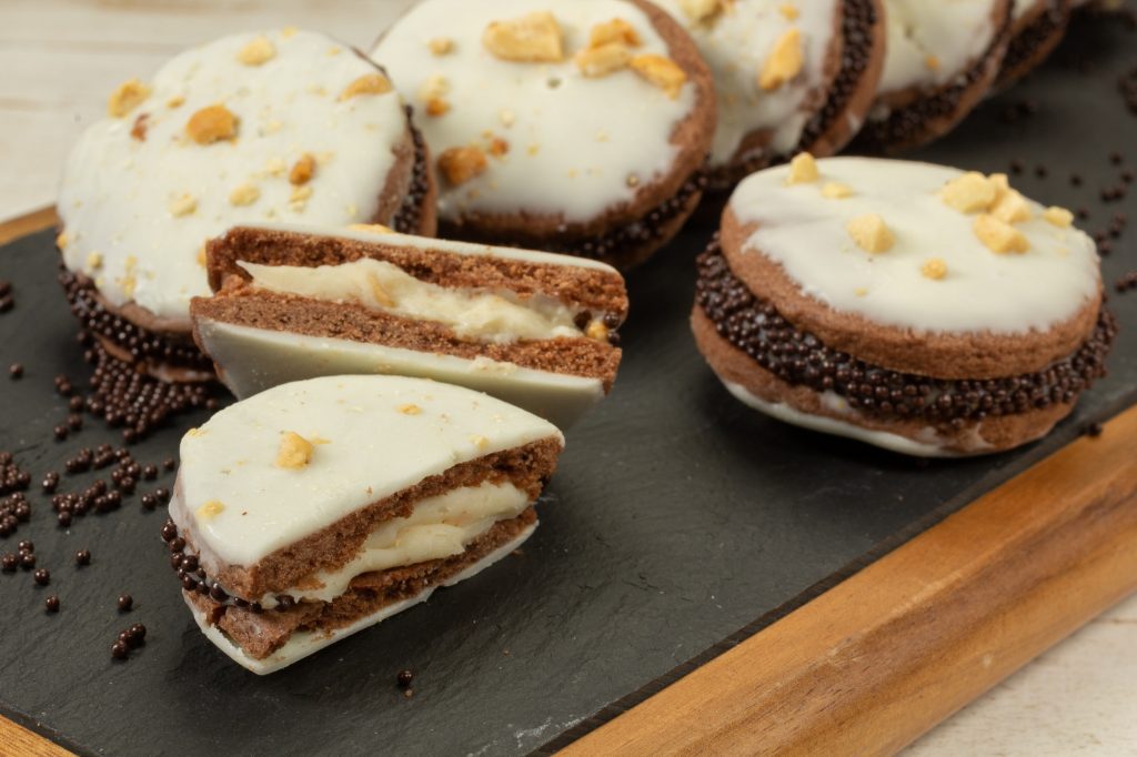 Em um recipiente, derreta a Cobertura Branca em banho-maria ou micro-ondas, passe as bolachas, decore com amendoim triturado e deixe secar. Recheie as bolachas com o recheio trufado de amendoim, feche e envolva a parte do recheio na Miçanga Sabor Chocolate.