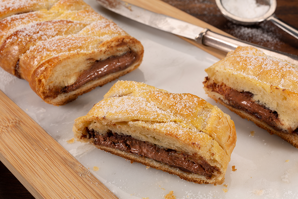 Em um recipiente, coloque a farinha de trigo, o açúcar, o sal e aos poucos coloque a água, mexendo sempre. Sove a massa até ficar lisa e elástica. Com o auxílio de um rolo, abra a massa no formato de retângulo, espalhe a margarina folhada e dobre em 3 partes. Estique novamente a massa e repita as dobras por mais 3 vezes. Abra a massa, coloque o Recheio Forneável de Chocolate e feche. Pincele com o ovo e leve ao forno preaquecido a 180 °C por aproximadamente 20 minutos. Retire e peneire Açúcar Gelado.