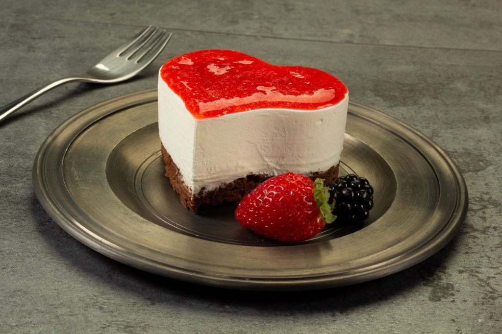 Corte a massa do brownie com o cortador de coração, reserve. Unte o aro com óleo ou desmoldante, coloque a base, preencha o aro com o creme e leve à geladeira até ficar firme. Retire da geladeira, desenforme e espalhe a geleia de morango.