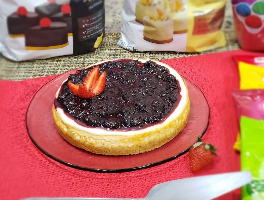 Coloque o creme na assadeira forrada com a base e leve para assar no forno preaquecido a 180°C por aproximadamente 25 minutos. Retire forno, deixe esfriar. Coloque a trufa, leve para cristalizar na geladeira. Retire, espalhe a geleia de amora e decore.