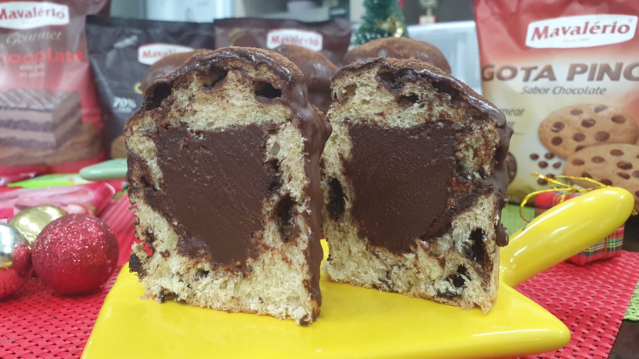 Recheio: Em um recipiente, derreta a Cobertura Meio Amarga em banho-maria ou micro-ondas. Acrescente o creme de leite, misture bem e recheie o chocotone.