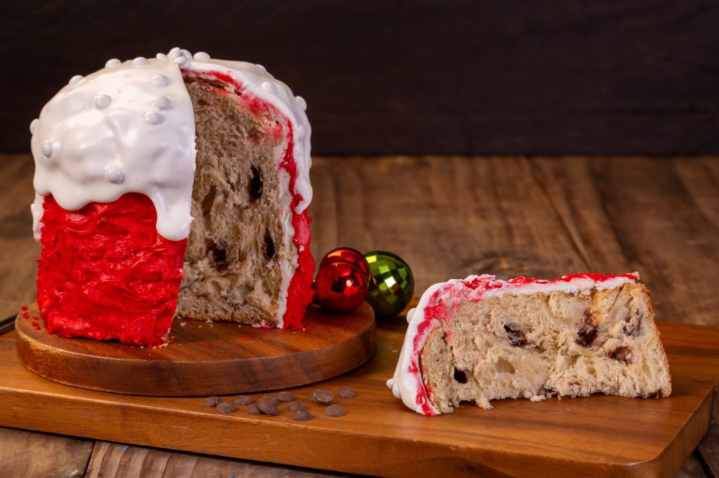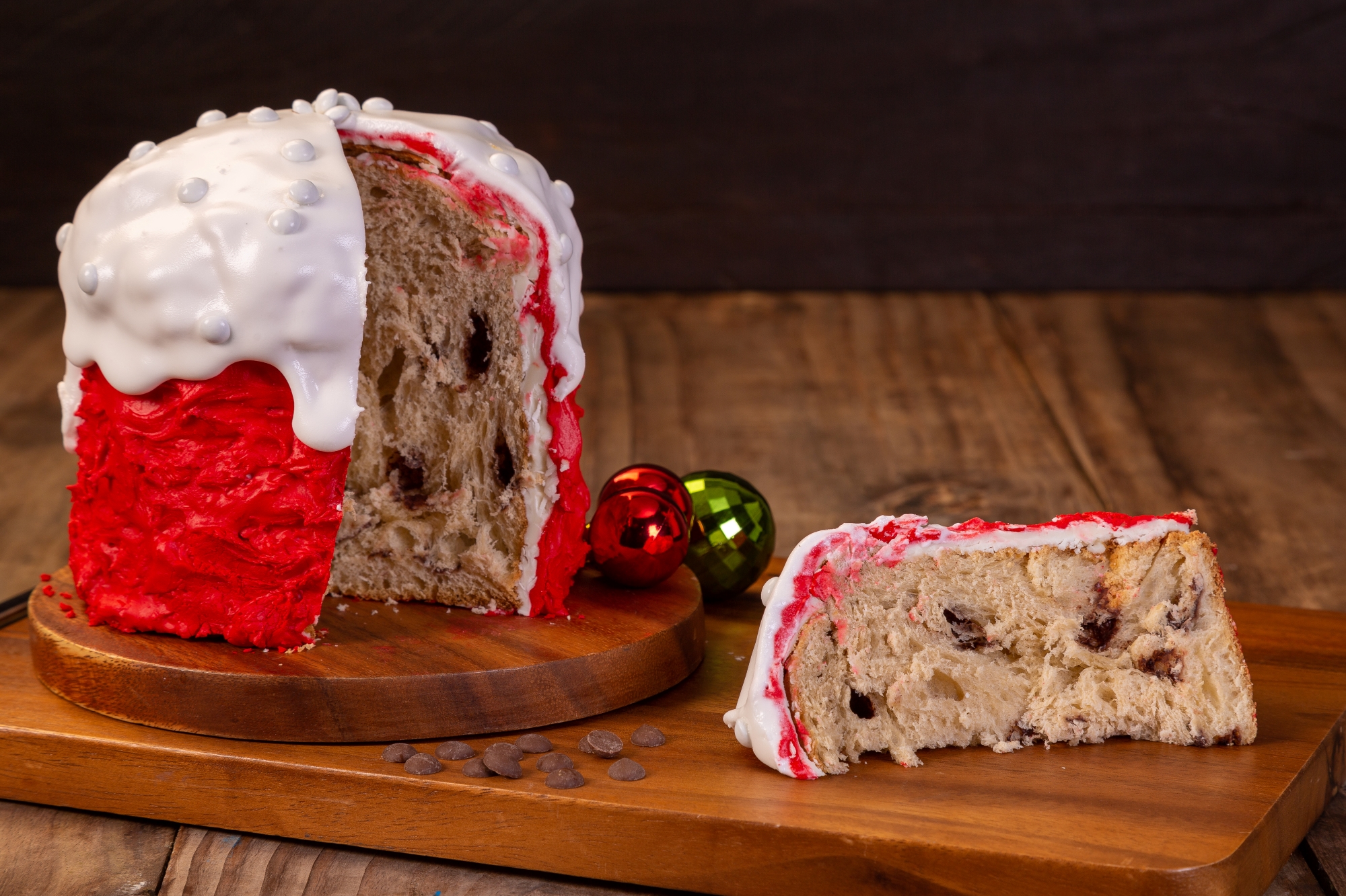 Em um recipiente, coloque o Pó para Glacê Real e a água aos poucos, misture bem e bata muito bem na batedeira com o batedor raquete. Em seguida, divida em dois recipientes, em um deles acrescente o corante em gel vermelho e misture até ficar na cor desejada. Espalhe o Glacê tingido de vermelho no chocotone, espere secar um pouco, em seguida, passe o Glacê Branco até a metade. Em seguida, cole os Chocogiros Branco.