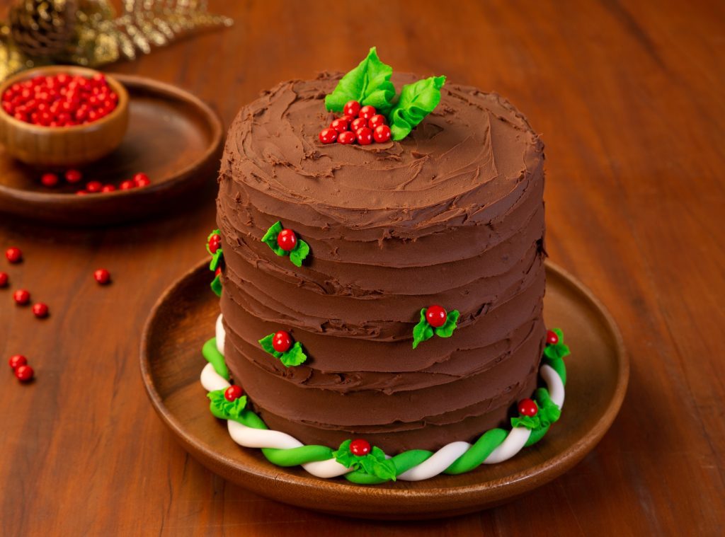 Corte a tampa do chocotone e retire o miolo. Intercale, dentro do chocotone, camadas do recheio trufado e do miolo. Finalize com a tampa virada para baixo. Em seguida, com o auxílio de uma espátula, espalhe a cobertura em todo chocotone, passe a espátula para os detalhes e reserve. Tinja parte da Pasta Americana com o corante em gel verde e faça uma tirinha. Faça uma tirinha com a Pasta Branca também. Em seguida, enrole as duas tirinhas e envolva-as no chocotone. Em um recipiente, coloque o Pó para Glacê Real, a água (aos poucos) e o corante em gel verde. Misture bem e bata, na batedeira, com o batedor raquete até ficar na cor desejada. Coloque o Glacê em um Saco de Confeitar com os Bico 352 e 366 e faça folhas no chocotone. Em seguida cole os Chocogiros Vermelho.