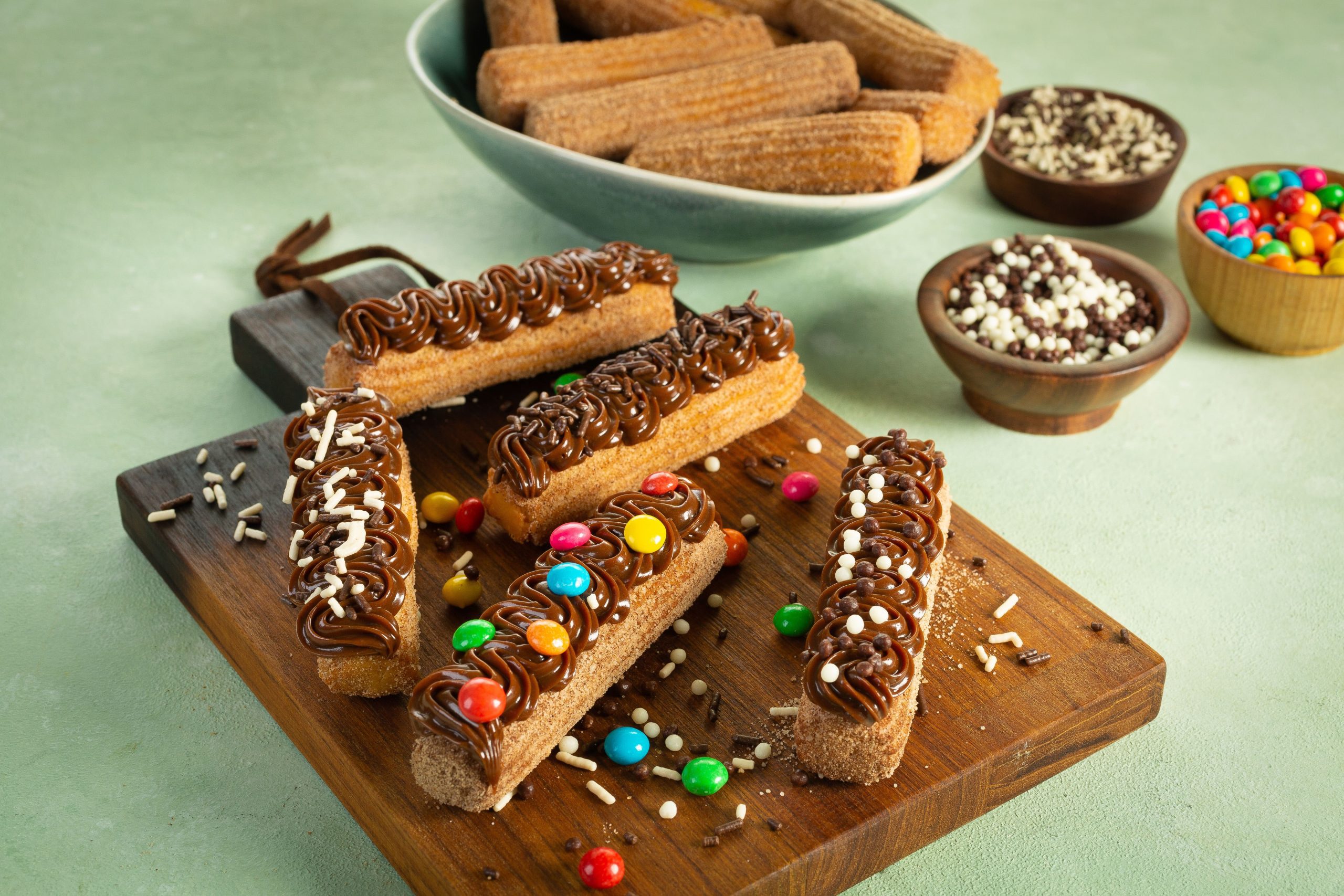 Coloque o brigadeiro express em uma Manga de Confeitar com Bico 21, pressione sobre os churros e finalize decorando com Granulado Mesclado, Granulado Macio, Chocogiros Colorido e Choco Power Ball Micro.