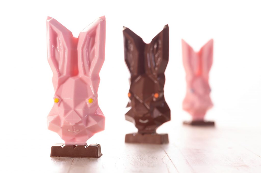 Casca: Em recipientes separados, derreta as Coberturas Branca e ao Leite em banho-maria ou micro-ondas. Acrescente o corante para chocolate rosa na Cobertura Branca derretida, misture bem até ficar na cor desejada. Preencha a forma em formato de coelho de silicone, seguindo as instruções do fabricante e a forma em formato de barrinha de acetato. Em seguida, leve à geladeira até ficar opaca, retire e desenforme.