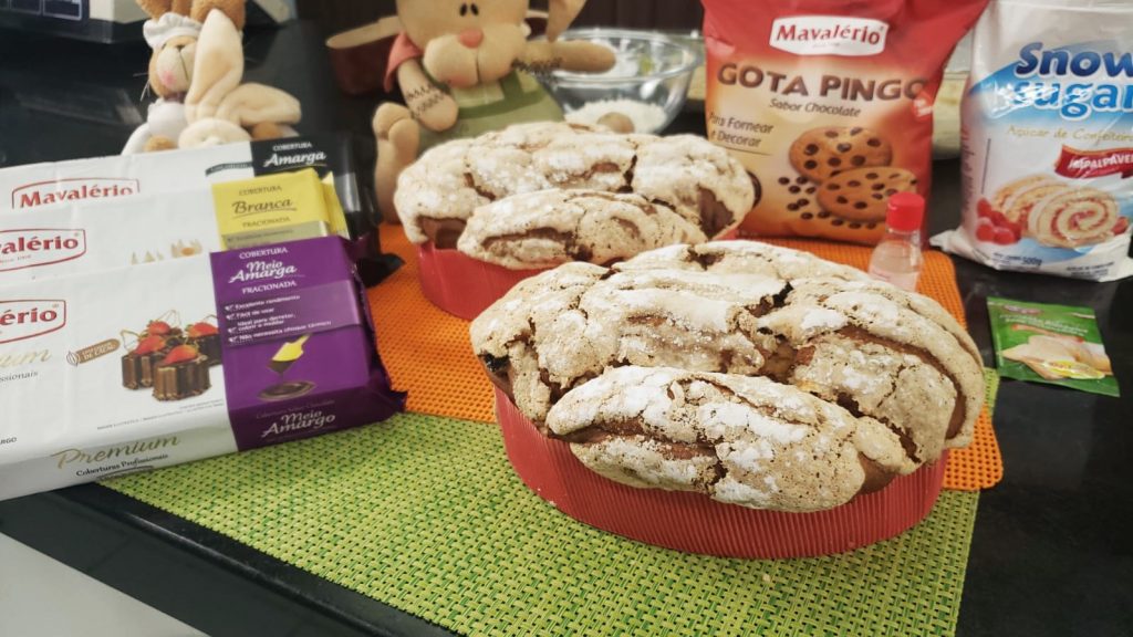 Reforço: Bata na batedeira o açúcar refinado, a margarina, a glucose líquida, o leite em pó, as gemas, o sal, a lecitina de soja, o aroma de panetone, o Aroma de Laranja e bata muito bem. Em seguida acrescente a farinha de trigo misture bem. Em seguida coloque na bancada e junte a espoja já fermentada, sove e coloque a água aos poucos, sovando muito bem até ficar uma massa lisa e enxuta. Em seguida acrescente as Gotas de Chocolate, misture e corte duas partes de 300g para o corpo da colomba e quatro partes de 100g as assas da colomba e deixe a massa descansar por 15 minutos. Em seguida abra a massa, enrole e coloque nas formas próprias para colomba e deixe crescer até atingir a borda da forma.