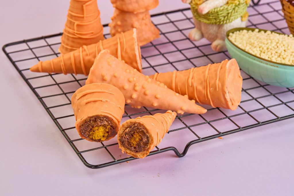 Cone: Em um recipiente derreta a cobertura branca em banho-maria ou micro-ondas, coloque o corante laranja até atingir o tom desejado, acrescente os flocos de cereais, misture, banhe os cones por dentro e por fora e deixe cristalizar.
