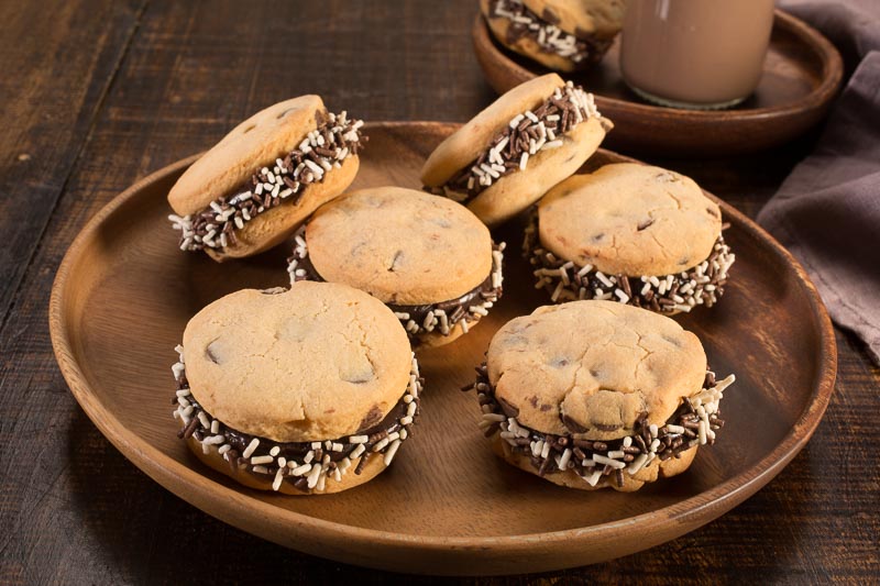 Pegue uma porção do brigadeiro, enrole, coloque entre dois discos de cookies e aperte. Em seguida passe a lateral toda no Granulado Mesclado.