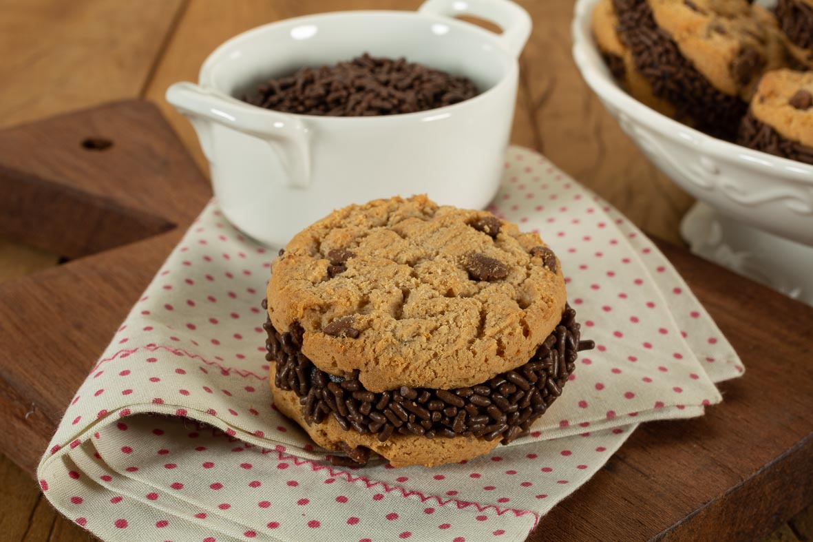 Enrole o brigadeiro e coloque entre dois cookies, aperte e passe a lateral no Granulado Macio.