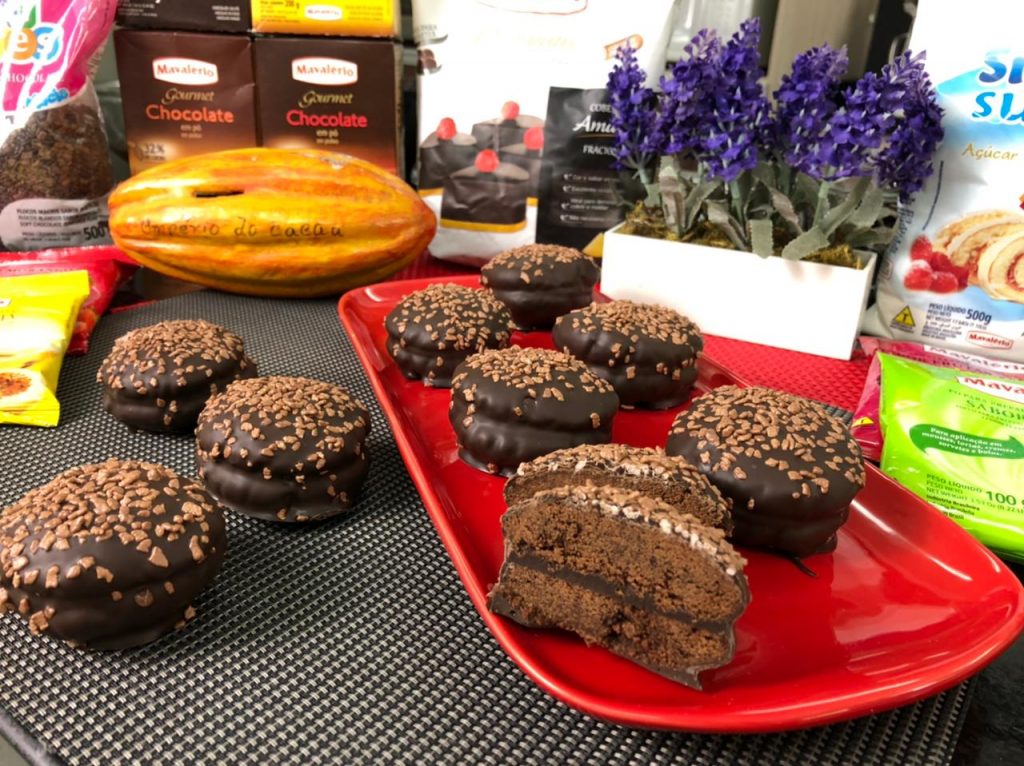 Recheio: Em um recipiente derreta a Cobertura Amarga em banho-maria ou micro-ondas. Acrescente o creme de leite, a manteiga e misture bem. Em seguida recheie os cookies, reserve.
