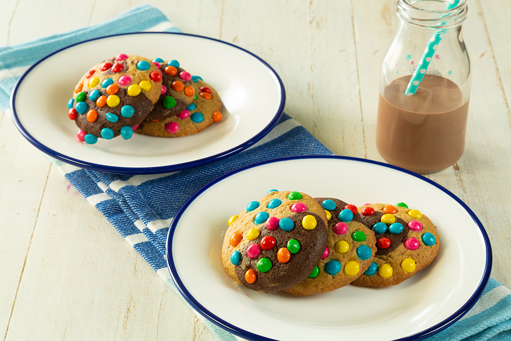 Em um recipiente, coloque a margarina sem sal em ponto de pomada, o Açúcar de Confeiteiro, o açúcar mascavo, a farinha de trigo, o ovo e o Fermento em Pó, misture bem até desgrudar das mãos. Em seguida, divida a massa em dois recipientes, em um dos recipientes, acrescente o Chocolate em Pó e misture bem. Pegue um pedaço de cada massa, boleie, passe no Chocogiros Colorido e coloque em uma assadeira baixa forrada com papel manteiga, achate na assadeira e leve para assar em forno preaquecido a 180 °C, por aproximadamente 15 minutos.