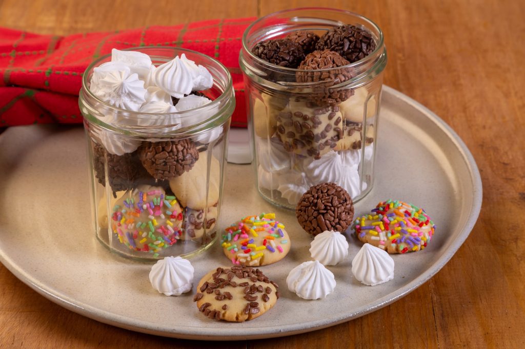 Coloque em copos de sua preferência, um pouco dos biscoitos, dos brigadeiros e dos suspiros.