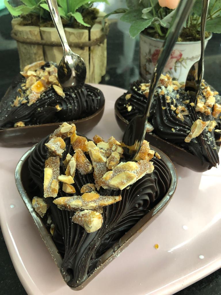Casca: Em um recipiente derreta a Cobertura ao Leite em banho-maria ou micro-ondas. Em seguida molde a forminha de silicone no formato de coração segundo as instruções do fabricante e leve para geladeira até ficar opaca.