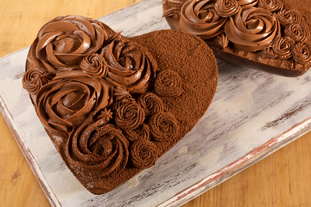Na batedeira, bata o recheio trufado e recheie a casca do coração. Em seguida, coloque o restante do recheio em uma manga de confeitar com bico pitanga, faça flores e por último peneire Cacau em Pó.