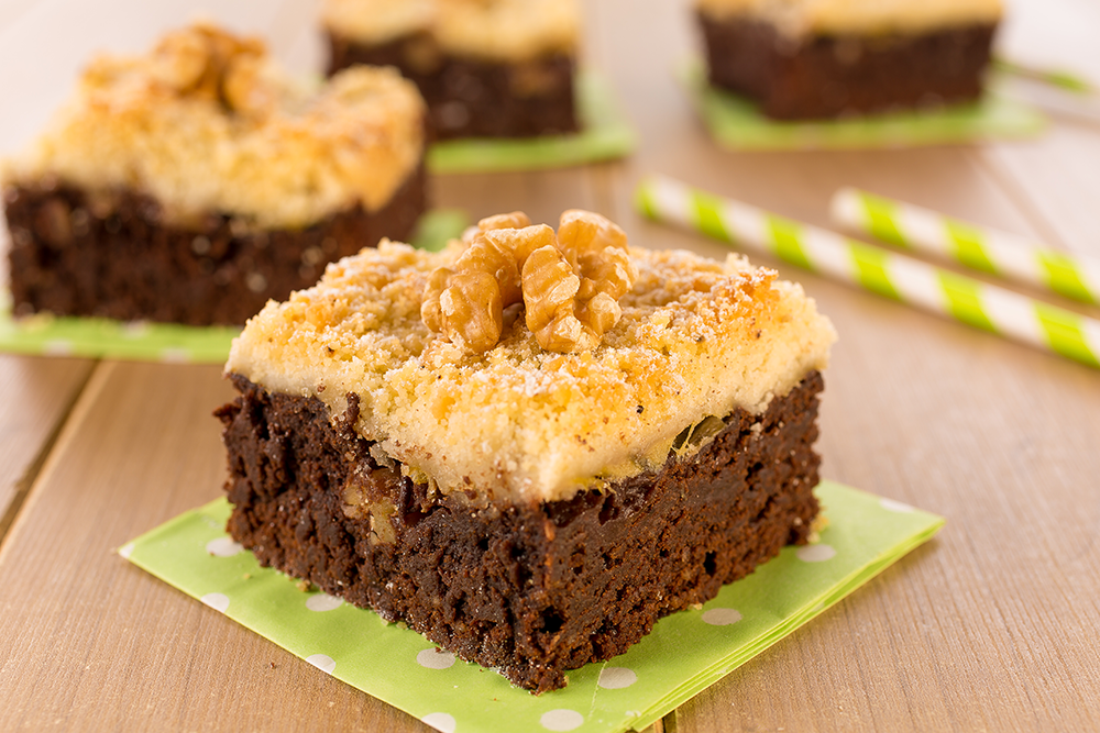 Espalhe a massa do brownie em uma assadeira untada, coloque fatias de banana e por cima espalhe a farofa. Leve ao forno preaquecido a 180 °C por aproximadamente 25 minutos. Corte no tamanho desejado e decore com nozes.