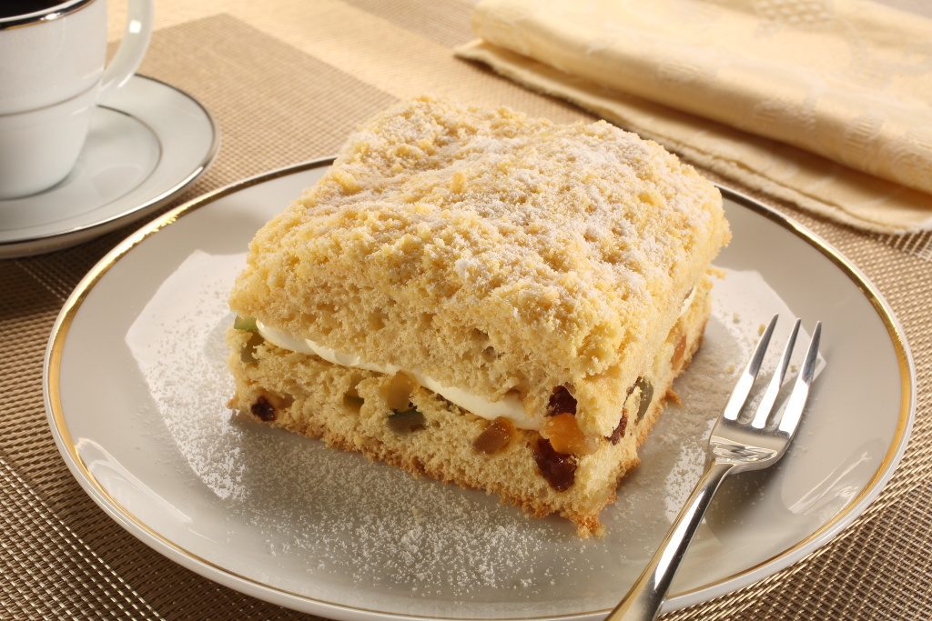 Decoração: Corte a cuca já fria e recheie com o creme de limão, peneire Açúcar Gelado e corte no tamanho desejado.