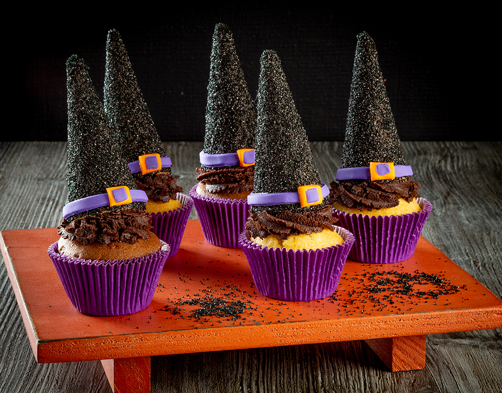 Coloque a cobertura de chocolate em uma manga de confeitar com bico pitanga e cubra o cupcake. Reserve. Em um recipiente, derreta a Cobertura ao Leite em banho-maria ou micro-ondas. Espalhe a Cobertura derretida no cone de sorvete com auxílio de um pincel e, em seguida, passe no Açúcar Preto. Reserve. Tinja a Pasta Americana com os corantes em gel roxo e laranja, abra com o auxílio de um rolo, corte tiras finas e quadradinhos da Pasta tingida de roxo e quadradinhos com a Pasta tingida de laranja. Cole a tira de Pasta roxa em volta do cone com a Cobertura derretida. Passe um pouco de água na tira e cole um quadradinho laranja. Depois, cole um quadrinho roxo sobre o laranja.