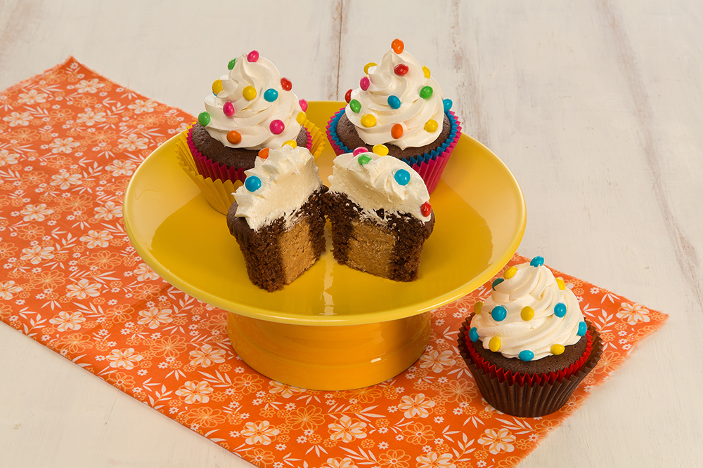 Coloque a cobertura em uma Manga de Confeitar e um Bico 1M e decore o cupcake. Finalize com Chocogiros Colorido, Amarelo, Azul e Rosa.