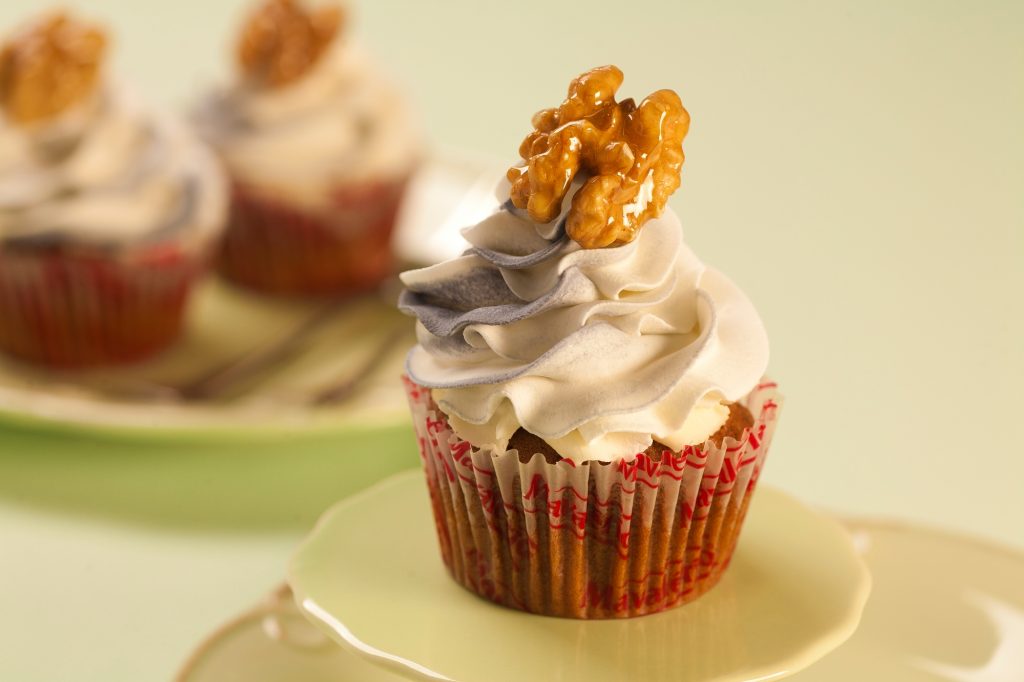 Recheie o cupcake ainda quente com o auxílio de uma Manga de Confeitar. Espere esfriar e decore com chantilly batido, riscos de corante em gel preto e nozes passada na geleia de brilho.
