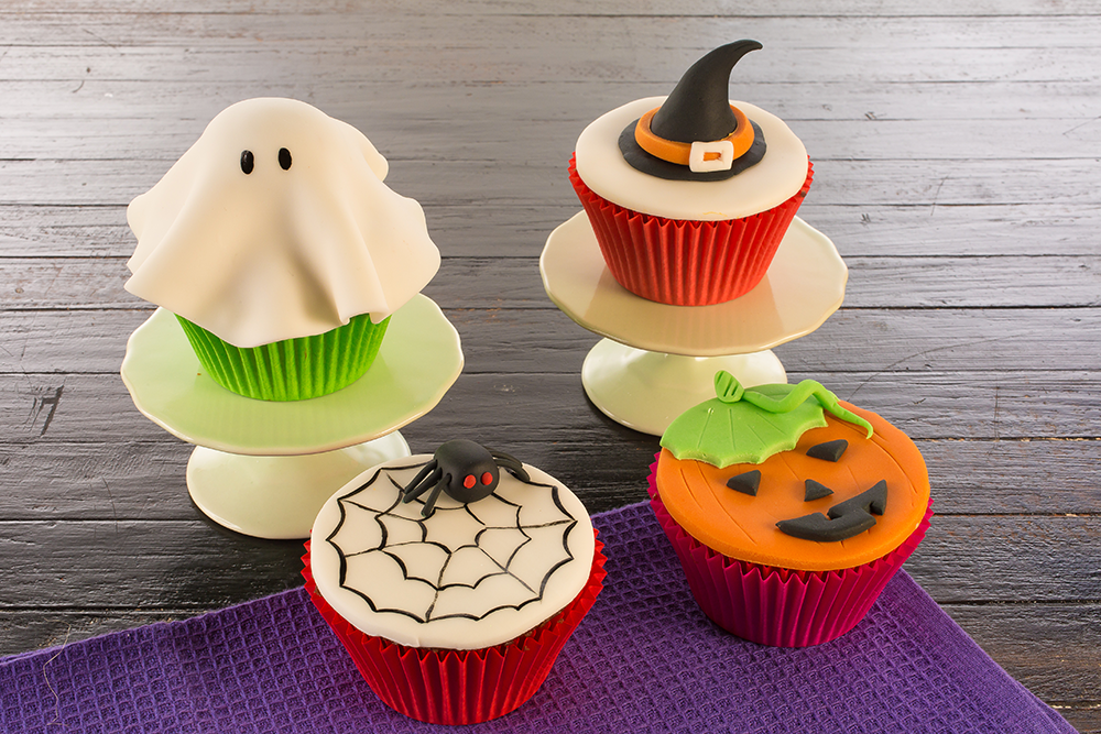 Com o auxílio de uma Manga de Confeitar e um Bico 230, recheie os cupcakes com o recheio cremoso de morango. Tinja a Pasta Americana usando corantes em gel laranja, preto, verde e vermelho e faça a decoração chapéu, abóbora, aranha e o fantasma.