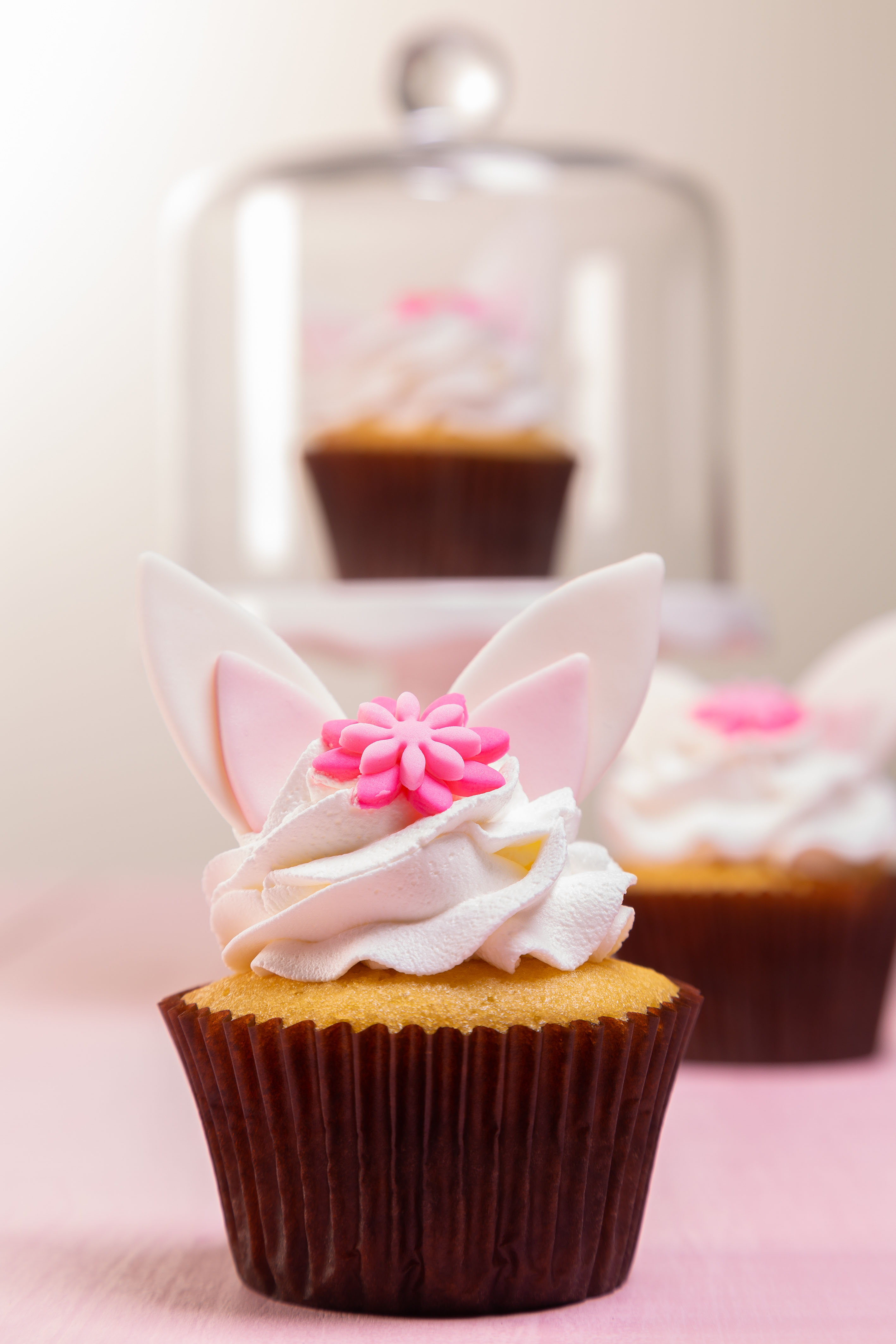Para fazer as orelhas, abra a Pasta Americana com o auxílio de um rolo e corte com um cortador em formato de folha. Reserve. Tinja a Pasta Americana com corante em gel rosa, até ficar no tom rosa claro e um pedaço mais escuro, abra com o auxílio de um rolo e corte com o cortador folha menor. Passe um pouquinho de água na orelha branca, cole a Pasta tingida de rosa claro e corte a base da orelha, reserve. Abra a Pasta Americana tingida de rosa mais claro e mais escuro com o auxílio de um rolo e corte flores, passe um pouquinho de água, cole uma sobre a outra e deixe secar. Quando as orelhas e as flores estiverem totalmente secas decore o cupcake.
