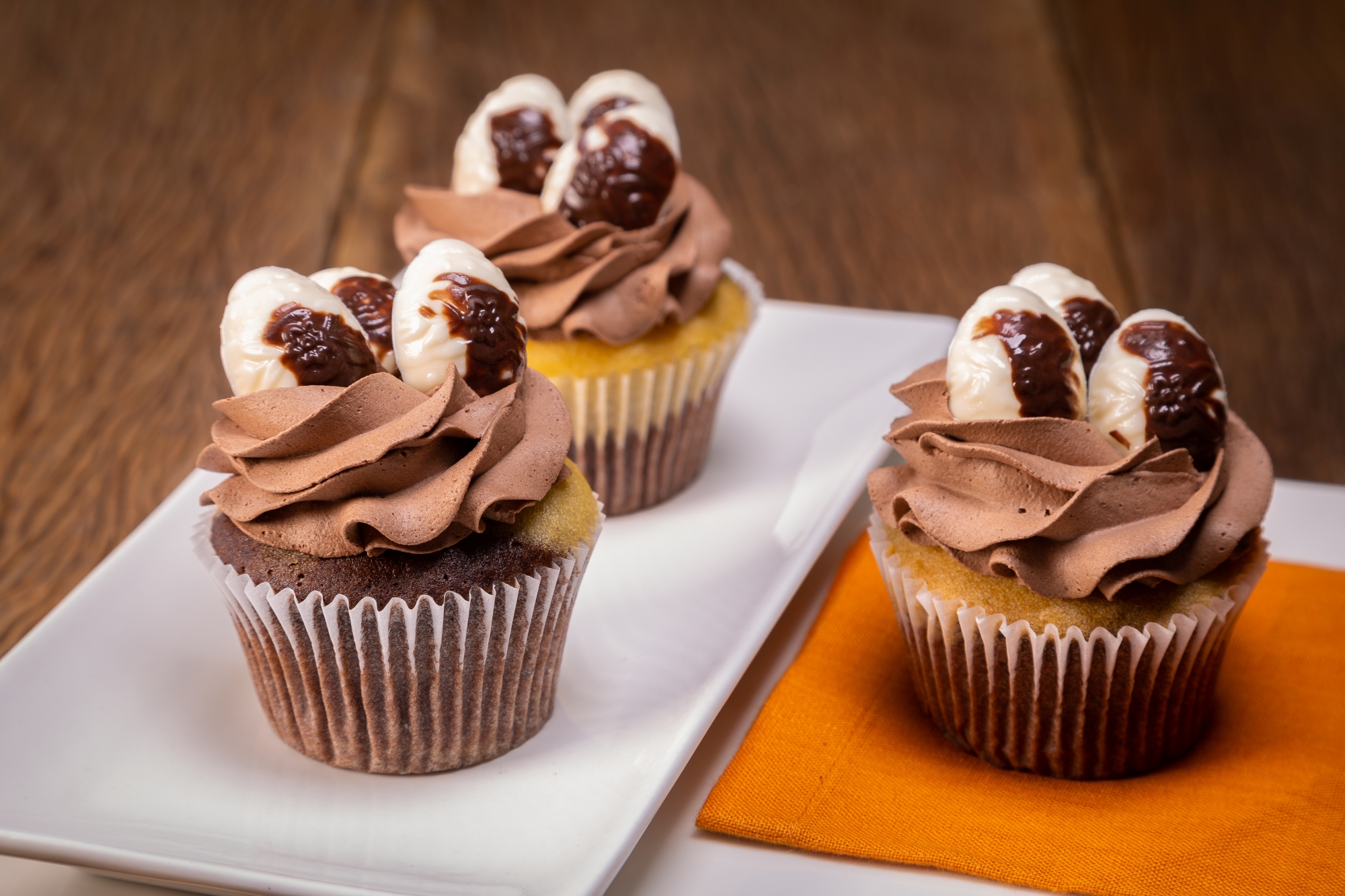 Massa: Em um recipiente, misture os ovos, o Açúcar de Confeiteiro, o óleo e o leite. Em seguida, acrescente o Fermento em Pó, a farinha de trigo, mexa e divida em 2 recipientes. Em um recipiente, acrescente o Aroma de Morango e no outro o Chocolate em Pó, misture. Intercale as massas em forminhas próprias para cupcake e leve para assar em forno preaquecido a 180 °C, por aproximadamente 20 minutos.