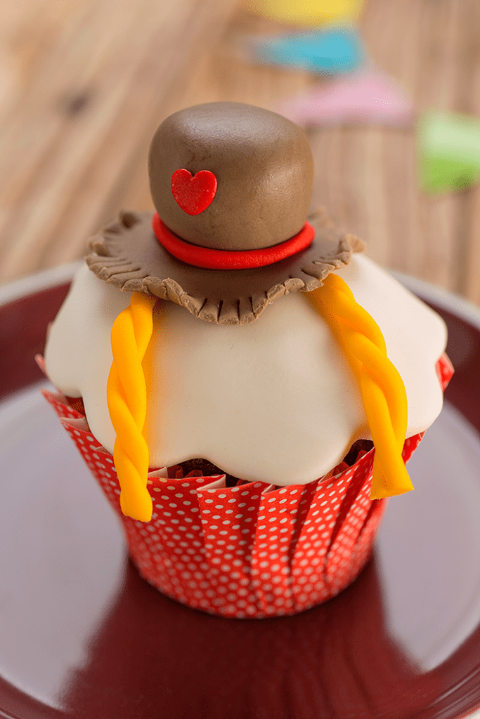 Com o auxílio de uma manga de confeitar e um bico ejetor, recheie os cupcakes ainda mornos. Tinja a Pasta Americana com corante em gel nas cores marrom, vermelho e amarelo. Modele um chapéu e uma trancinha, finalize com um Confeito Coração Vermelho.