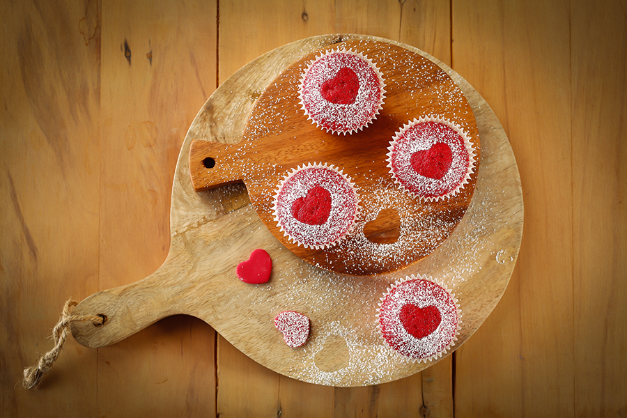 Coloque um papel-manteiga cortado no formato de coração sobre o cupcake e polvilhe Açúcar Gelado. Em seguida retire o papel.