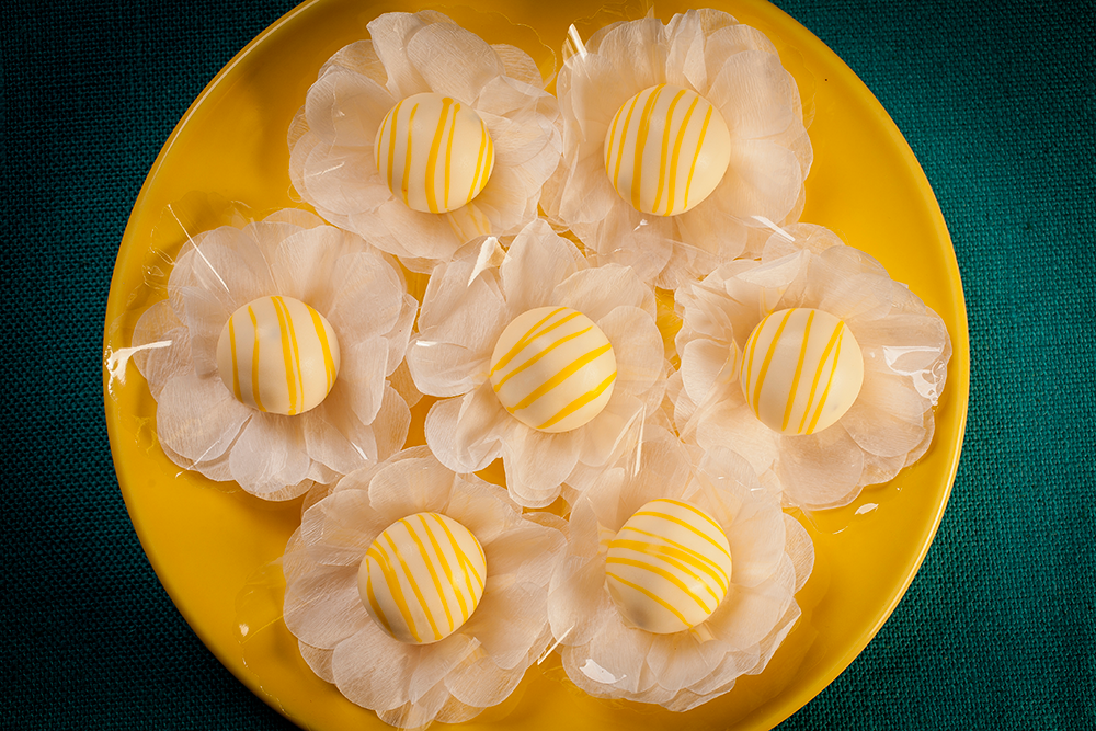 Faça bolinhas de 15 g e banhe na Cobertura Branca derretida em banho-maria ou no micro-ondas. Faça riscos com a Cobertura Branca tingida com corante amarelo.