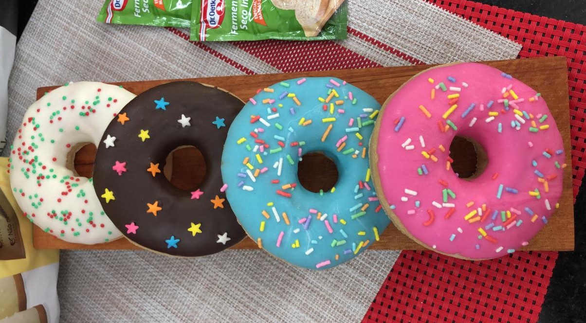 Recheie os donuts com o creme de limão e em seguida banhe na Cobertura Meio Amarga e na Cobertura Branca derretida em banho-maria ou micro-ondas. Decore com os Flocos Sabor Chocolate e com Granulado Colorido.