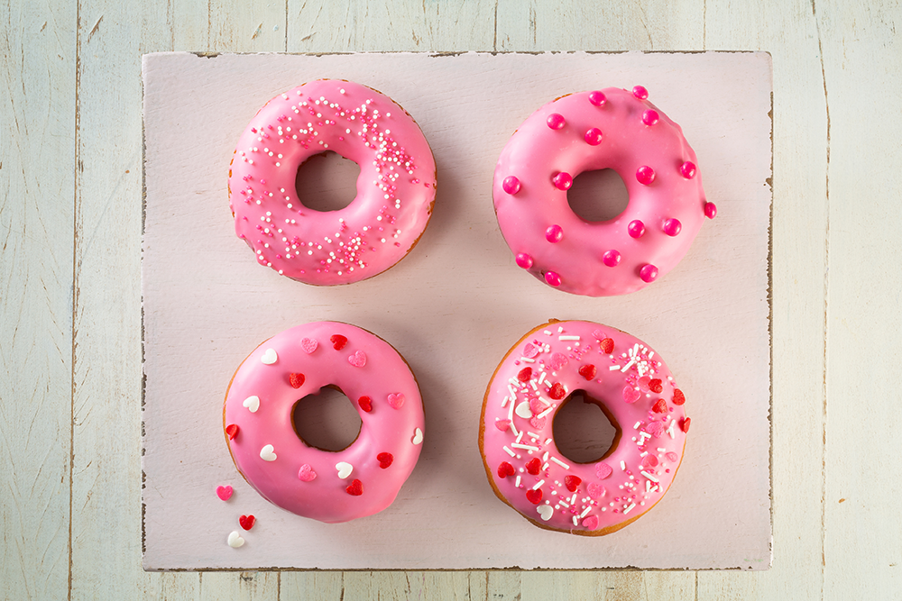 Em um recipiente, derreta a Cobertura Branca em banho-maria ou micro-ondas, acrescente o corante rosa próprio para chocolate e misture até ficar na cor desejada. Em seguida, banhe os donuts e decore com Miçanga Branca e Rosa, Confeito Figura Coração e Chocogiros Rosa. Decore também fazendo um mix com os Confeitos Miçanga Branca e Rosa, Figura Coração e Granulado Branco.