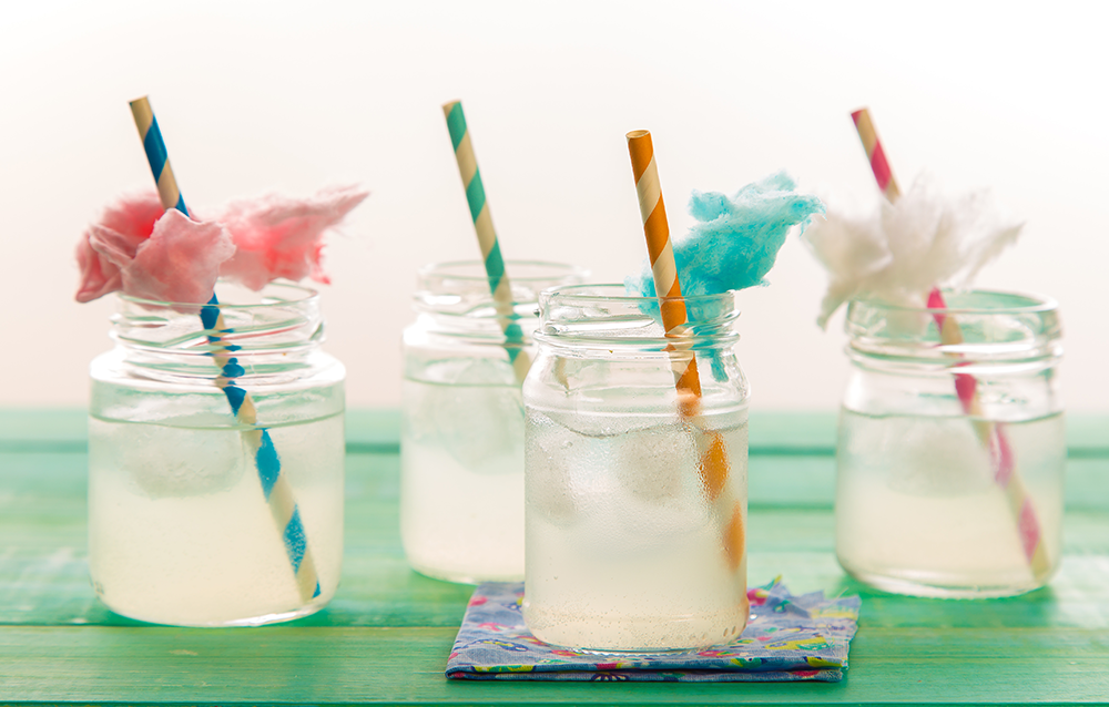 Coloque no liquidificador a água com gás, as pedras de gelo, o Açúcar Branco e o Pó de Limão. Bata bem, sirva em copos e decore com os Algodões Doces de Tutti-Frutti, Uva e Original.
