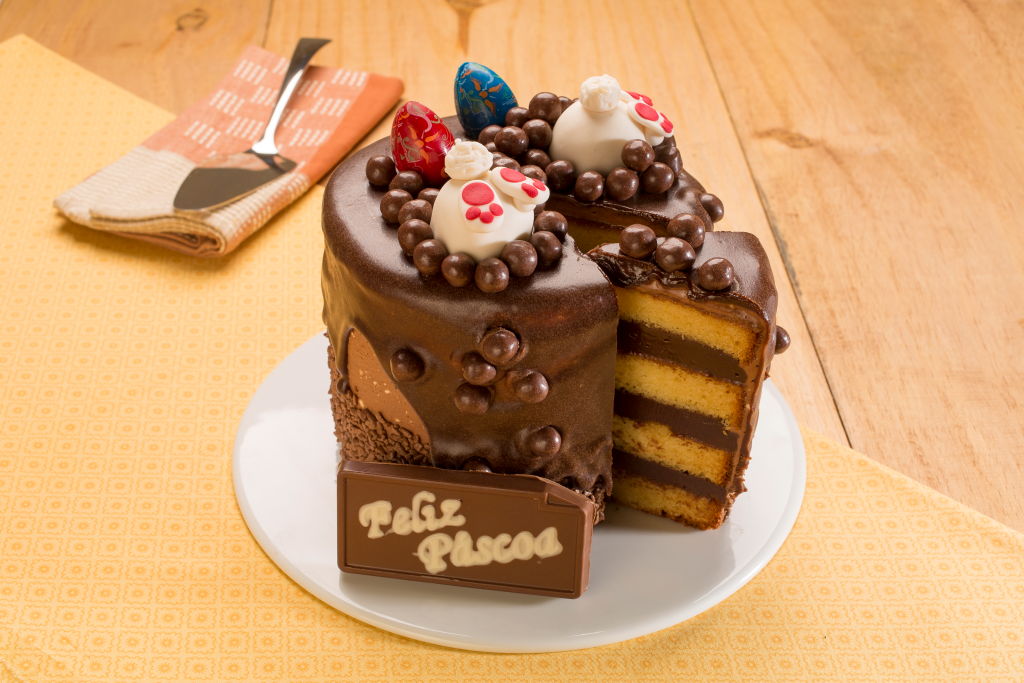Monte o bolo em uma assadeira alta, intercalando fatias de bolos com o recheio. Retire o bolo da assadeira e com o auxílio de uma espátula passe uma camada fina do próprio recheio em todo o bolo. Espalhe a cobertura sobre o bolo deixando cair pelas laterais. Passe os Flocos Crocantes em toda base do bolo. Modele dois coelhos como se estivessem dentro do bolo e para o detalhe da patinha tinja a Pasta Americana com o corante em gel vermelho.