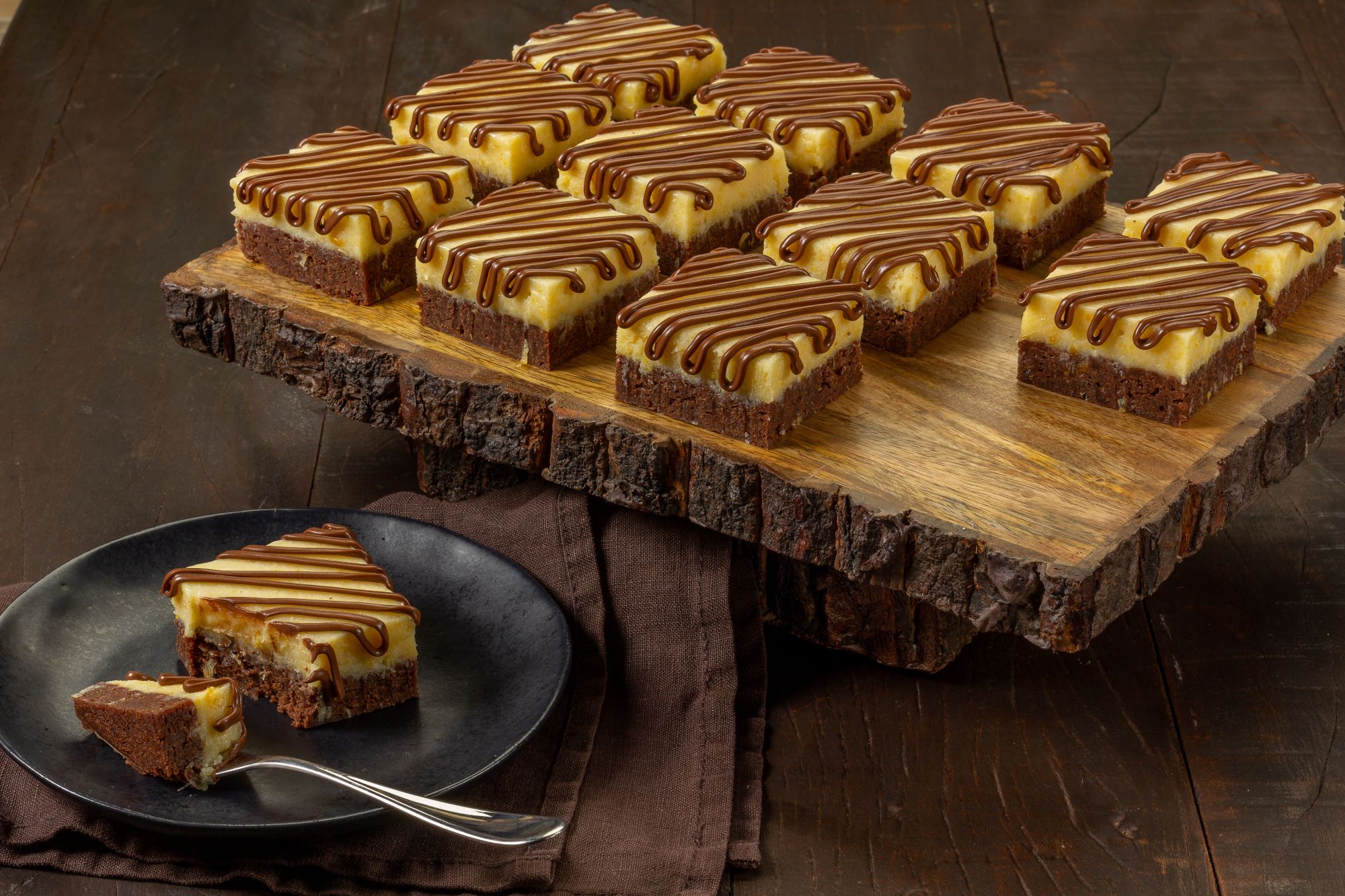 Espalhe a trufa de milho sobre a massa do brownie já frio e leve à geladeira até ficar consistente. Retire da geladeira, corte como desejar e reserve. Em um recipiente, derreta a Cobertura Blend em banho-maria ou micro-ondas, acrescente o creme de leite e misture bem. Coloque em uma manga de confeitar e decore os pedaços de brownie reservados.