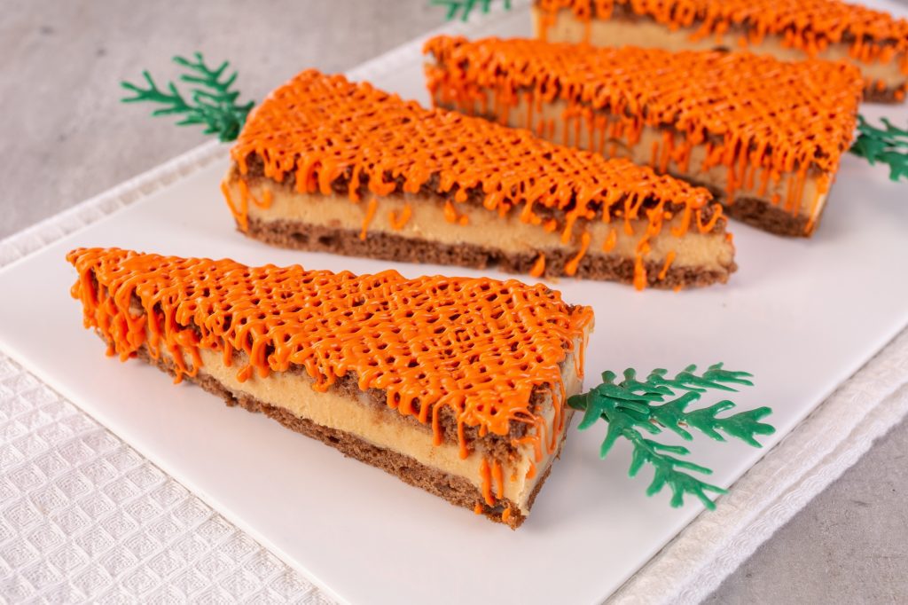 Fatie o bolo e forre uma assadeira com plástico. Em seguida, intercale camadas do pão de mel e do recheio trufado de doce de leite. Desenforme, corte fatias e reserve. Em um recipiente, derreta a Cobertura Branca em banho-maria ou micro-ondas. Divida a Cobertura derretida em dois recipientes e tinja com os corantes próprios para chocolate, laranja e verde. Coloque a Cobertura verde em uma manga de confeitar, faça risquinhos sobre um papel-manteiga, espere secar e espete no recheio. Para o detalhe da fatia, coloque a Cobertura laranja em manga de confeitar e faça risquinhos.
