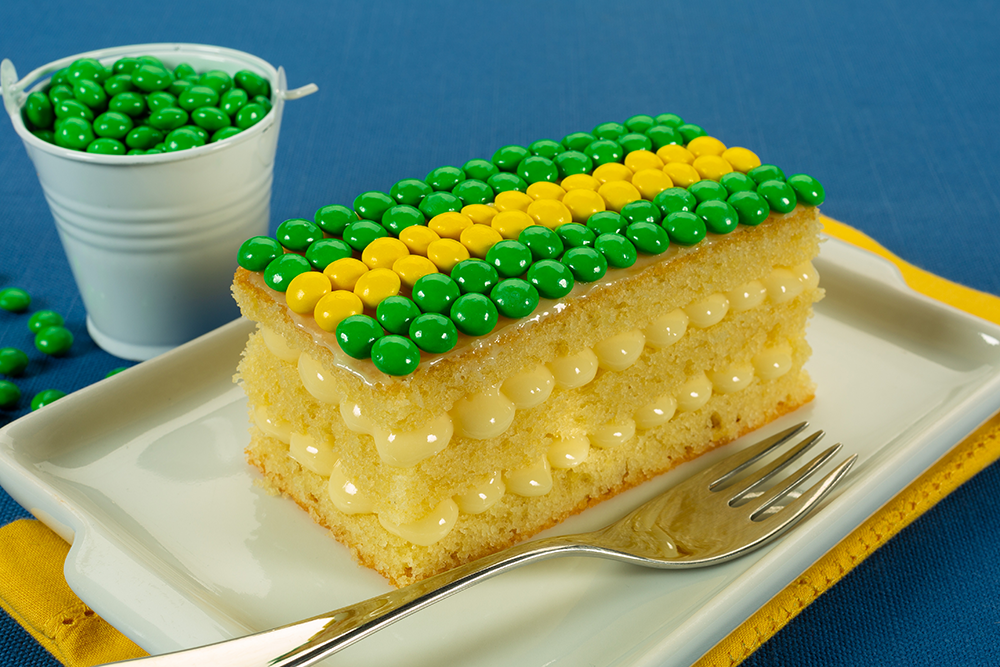 Corte o bolo em fatias e com o auxílio de uma manga de confeitar intercale camadas do recheio creme de limão com as fatias de bolo. Finalize com o creme e decore com Chocogiros Verde e Amarelo.