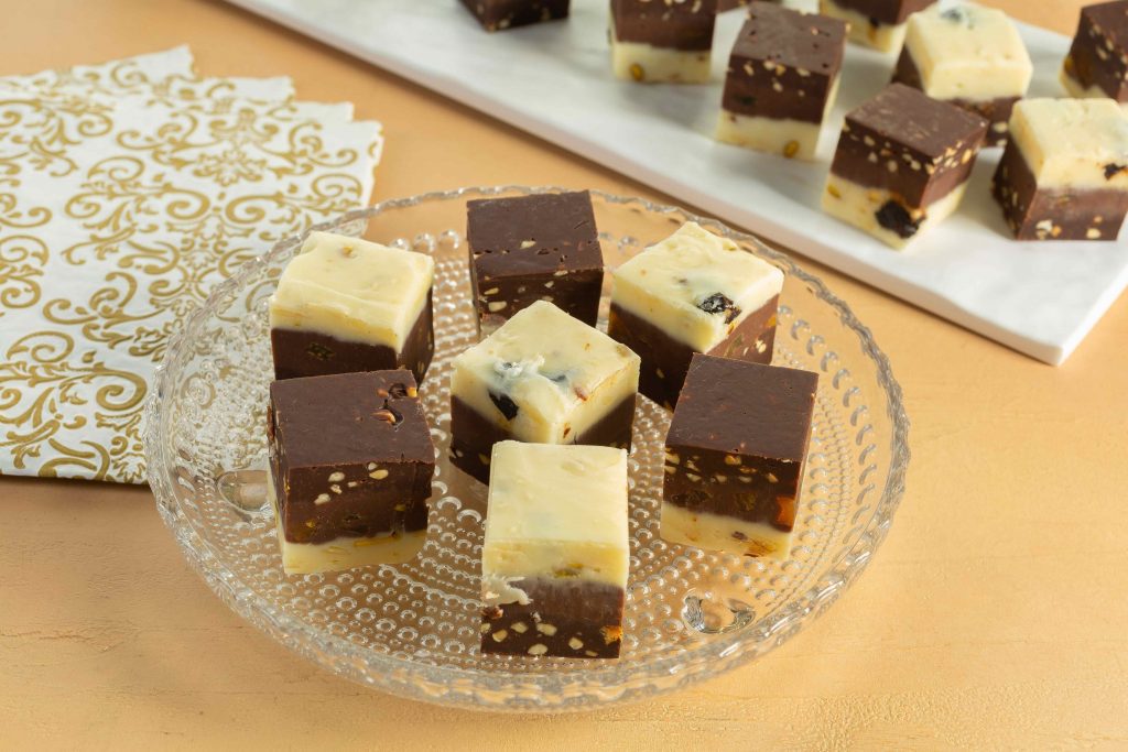 Espalhe o fudge amargo em uma assadeira 20 x 20 cm forrada com filme plástico. Em seguida, espalhe o fudge blend e o fudge branco. Deixe cristalizar e corte no tamanho desejado.
